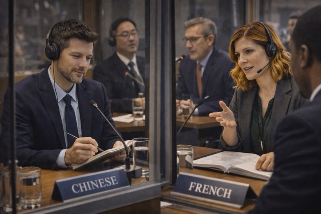 Hacer de interprete o mediador/a lingüístico en una conversación o conferencia de personas que hablan distintos idiomas.