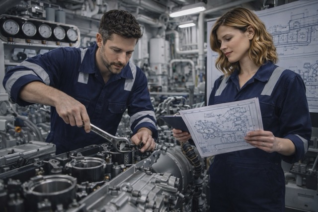 Reparar los motores y maquinaria de un buque y diseñar la maquinaria correcta para la navegación